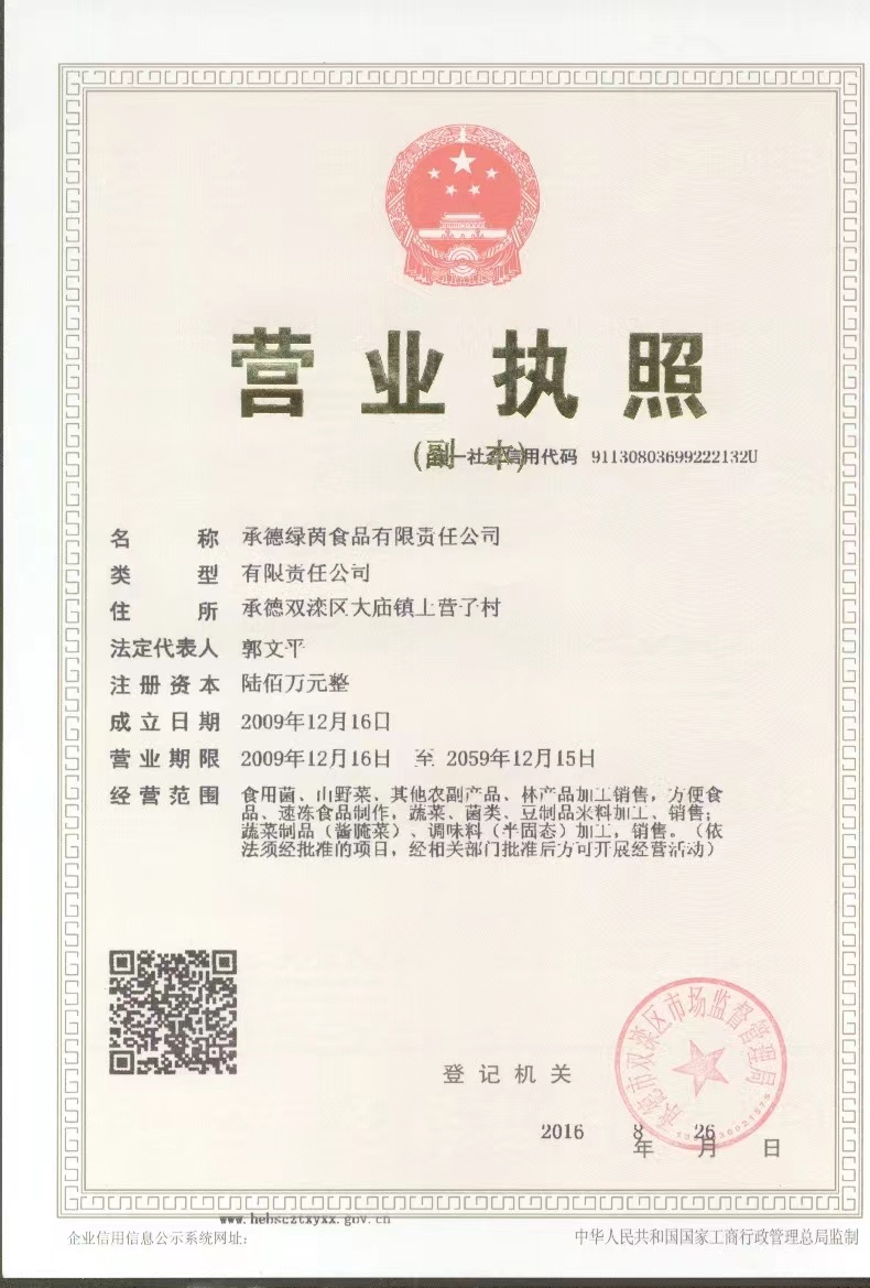 承德綠茵食品有限責任公司成立于2009年12月16日,坐落于河北省承德市雙灤區大廟鎮上營子村經濟開發區,是一家生產食用菌、山野菜、蘑菇醬、罐頭食品、方便菜肴、預制菜、調味品、鹽水杏仁、休閑食品的加工企業,年加工生產各種食用菌、山野菜3000噸。公司現有管理人員10人,員工60人,專業技術人員5人,高級職稱2人。